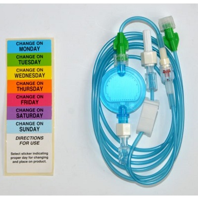 Przedłużacz iniekcyjny, wyposażony w filtr infuzyjny, zastawki antyzwrtotne oraz zaciski na przewód. Długość 150 cm.
