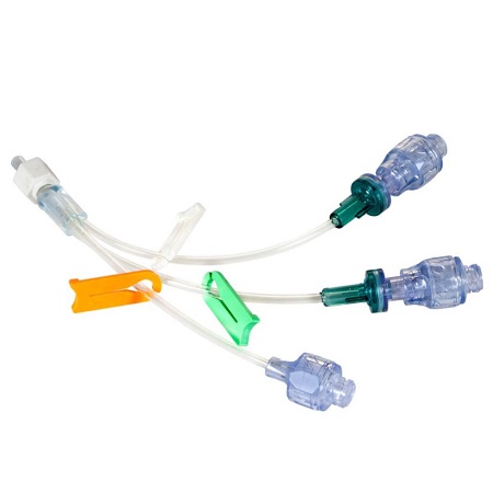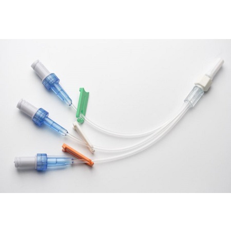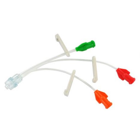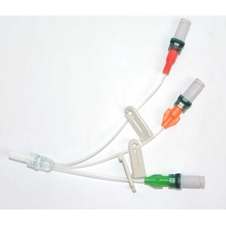Przedłużacz bezigłowy trójdrożny. Przedłużacz przeźroczysty. Aby zidentyfikować różne linie infuzji, każda linia ma węzeł o innym kolorze. Przedłużacz dostępny z zastawką antyzwrotną, Autoflush, Bionector, Vadsite.