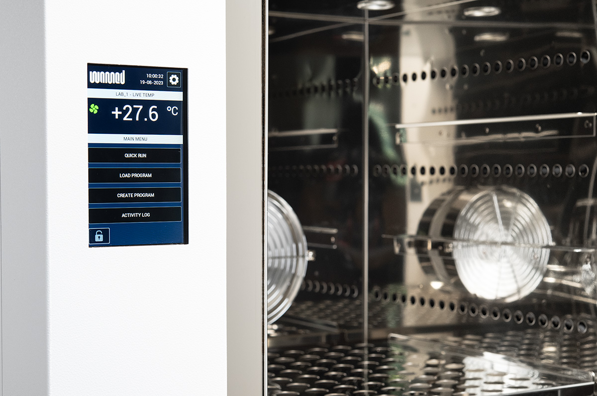 nieprzerwany podgląd aktualnej temperatury w komorze, stanu programu i ekspozycji, pracy grzałek oraz wentylatora (w przypadku wymuszonego obiegu powietrza)