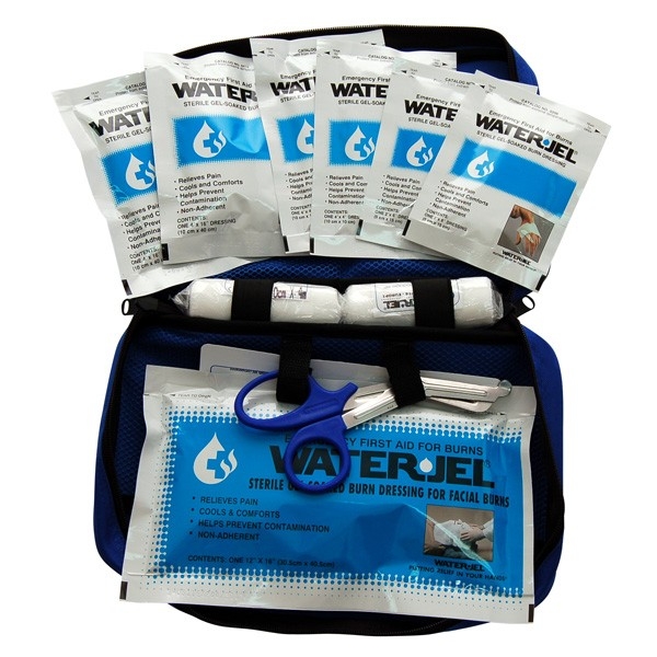 Zestaw opatrunków hydrożelowych Water Jel na oparzenia w torbie, skonstruowany zgodnie z wytycznymi KSRG z 12 lutego 2013.