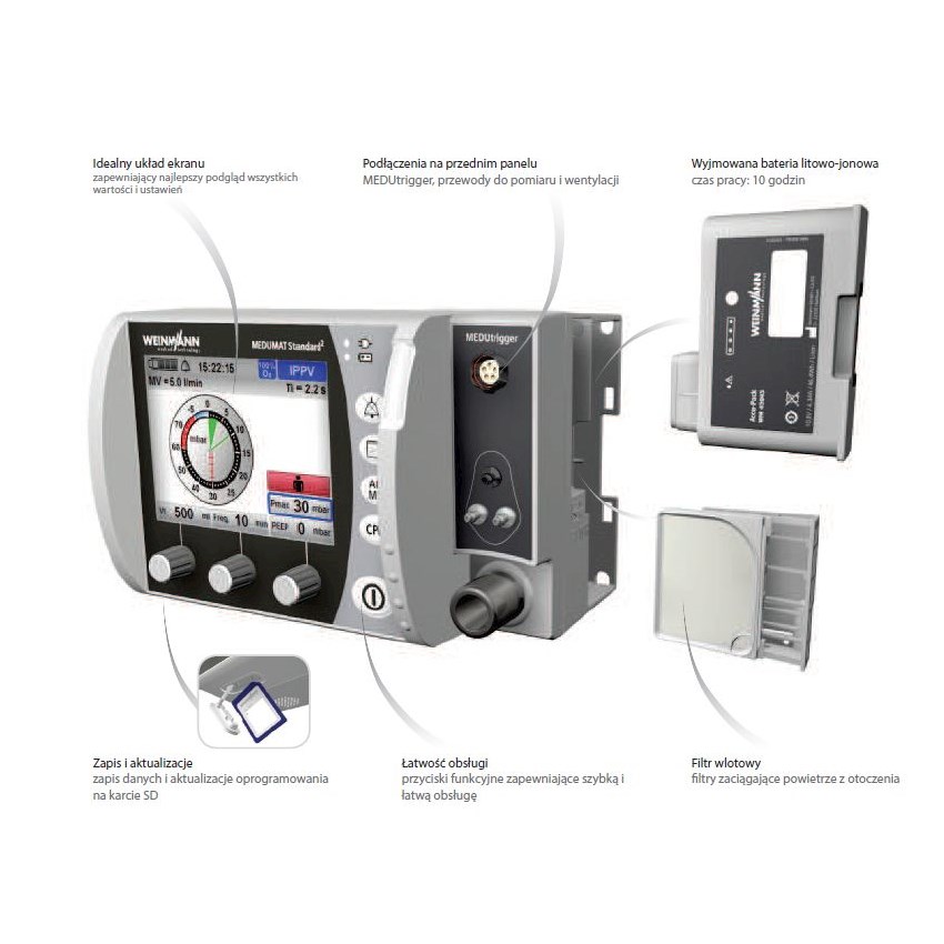 Medumat Standard 2 posiada intuicyjne ustawiania parametrów wentylacji w oparciu o wzrost pacjenta. Zoptymalizowano monitoring – 5-calowy ekran TFT wyświetla wszystkie istotne informacje.
