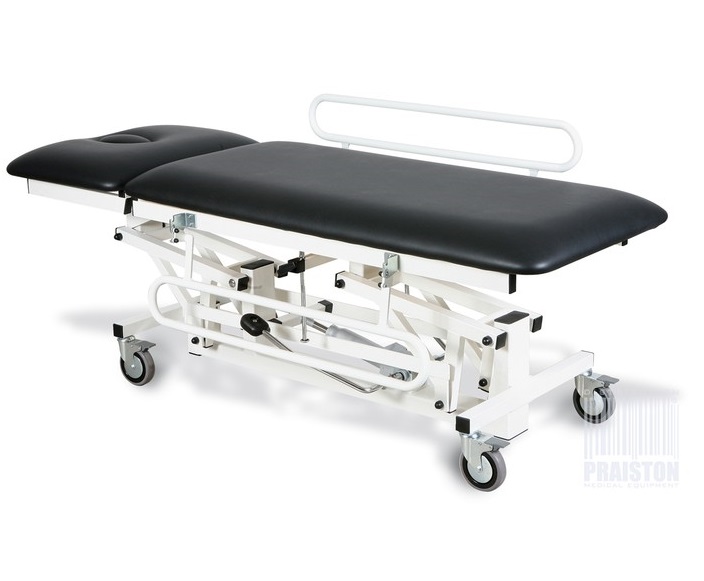 - PRA2HV1 - W standardzie występuje dwuczęściowe leże wykonane ze sklejki z węższym blatem w segmencie nożnym, Regulacja stołu odbywa się za pomocą siłownika hydraulicznego oraz posiada koła z układem hamulcowym,