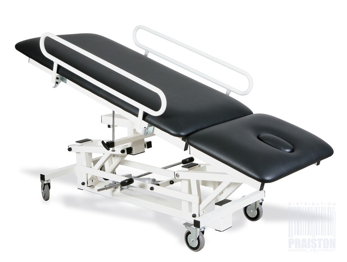 - PRA3HSS - W standardzie występuje trzyczęściowe leże wykonane ze sklejki oraz z dzielonym segmentem nożnym, Regulacja stołu odbywa się za pomocą siłownika hydraulicznego oraz posiada koła z układem hamulcowym,