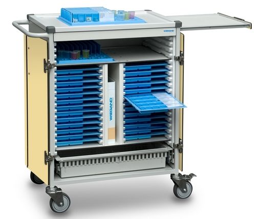 Wózek medyczny do transportu leków, na tace i pojemniki "MediDispenser" typu : 11. Specyfikacja: profilowany blat Sanitized ® pokryty jonami srebra, wysuwany blat roboczy, prowadnice na tace MediDispenser, ergonomiczny uchwyt, taca na materiały i pomoce pielęgniarskie i zapasowe leki, drzwi zamykane na zamek.