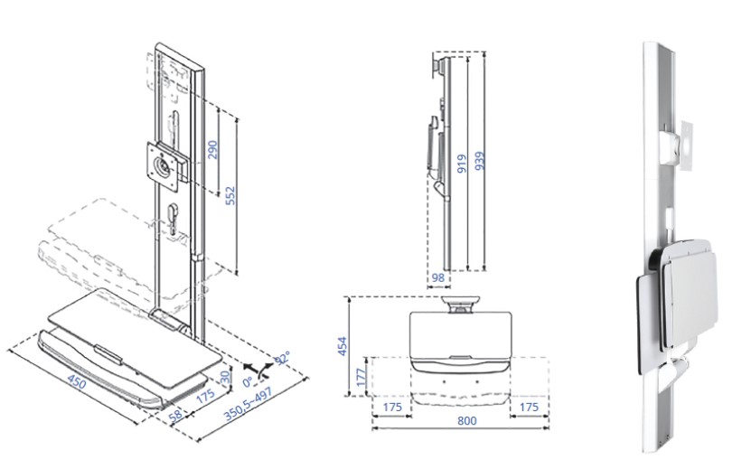 Najczęstsze zastosowanie to stacja robocza pielęgniarska lub do przeglądania zdjęć DICOM. Dzięki możliwości szybkiego złożenia półki na klawiaturę uchwyt umożliwia mocowanie w wąskich przejściach narażonych na duży ruch personelu oraz jezdnych mebli medycznych.