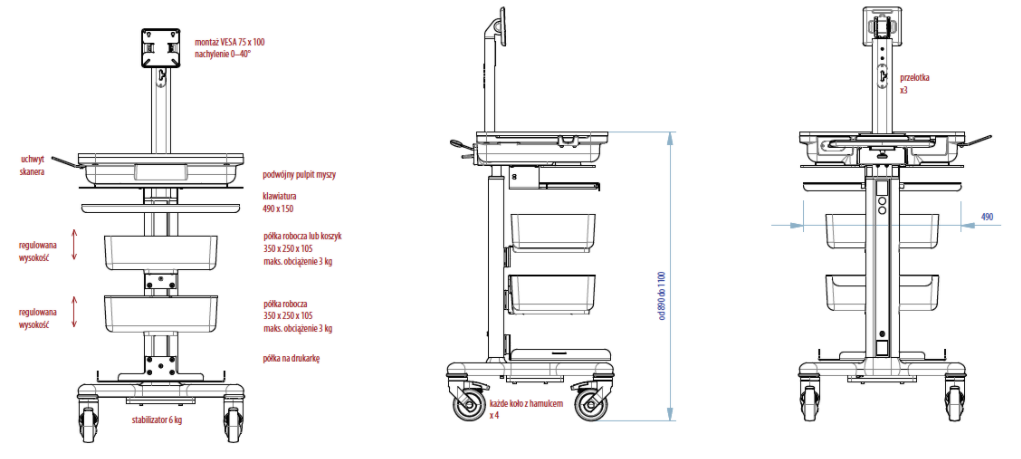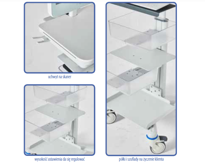 Medyczna mobilna stacja robocza X1 do pracy w warunkach szpitalnych, bloku operacyjnego, OIOM, SOR, OAIT do komputerów z własnym zasilaniem (24/7). Zbudowana jest na konstrukcji aluminiowej wyposażonej w szyny montażowe przeznaczone na półki i szuflady na życzenie klienta. Podstawa jezdna czterokołowa z hamulcami (kolorowe wykończenie do wyboru różne kolory). Wyposażony może być w wysuwaną półkę na klawiaturę, mysz oraz blat roboczy z regulacją wysokości.