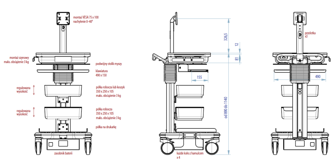 Medyczna mobilna stacja robocza X3PLUS B do pracy w warunkach szpitalnych, bloku operacyjnego, OIOM, SOR, OAIT z własnym zasilaniem lub bez (do komputerów z własnym zasilaniem 24/7). Zbudowana jest na konstrukcji aluminiowej wyposażonej w szyny montażowe, przeznaczone na półki i szuflady wg życzenia klienta.
