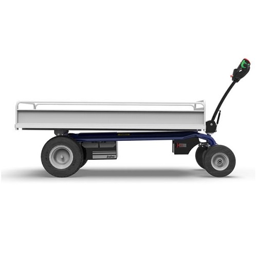 Wózek z napędem Zallys Jespi L z 4 kołami i platformą ładunkową ułatwia przenoszenie ładunków i może być używany jako podwozie elektryczne do przewożenia innego sprzętu.