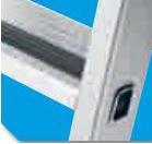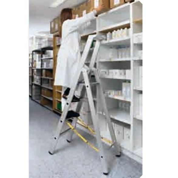 Drabina z bezpiecznymi stopniami - wchodzenie z jednej strony. Technologia bezpiecznych stopni ZARGES z okrawędziowaniem.