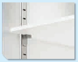 Półka z litego tworzywa sztucznego z otworami na szuflady teleskopowe i uchwyty nieckowe.