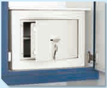 Sejf na środki znieczulające (ochrona antywyważeniowa B wg VDMA 24 992), stal, lakierowana na kolor jasnoniebieski, RAL 7035, zawiasy chronione przed skręcaniem, 2 otwory w tylnej ściance, materiał do zakotwienia, 1 półka, pancerny zamek dwubródkowy, 2 klucze, wymiary (wys. x szer. x gł.): ok. 425 × 412 × 570 mm