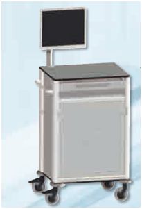 Wózek do wizyt medycznych, pod sprzęt komputerowy, szer. 0,5 ISO, wys. 1100 mm na roletach, ramię z wyświetlaczem i półką na klawiaturę.