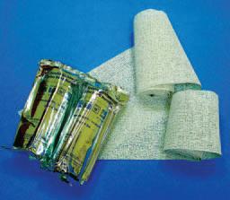 WŁAŚCIWOŚCI: szybkowiążąca; umożliwia wykonanie bezpiecznego opatrunku gipsowego; krótki czas zanurzenia oraz całkowite i jednorodne nasycenie opatrunku wodą; łatwość modelowania, dobra jakość i trwałość gotowego opatrunku gipsowego; bardzo dobre parametry użytkowe, ekonomiczna w użyciu; czas wiązania wstępnego opaski: od 5 do 6 minut (temperatura wody 20°C), sztywnienie następuje po 8-10 minutach, czas moczenia opaski: od 8-10 sekund. ZASTOSOWANIE do usztywnienia kończyn. Dostępne rozmiary: 10cm x 3m, 12cm x 3m, 15cm x 3m