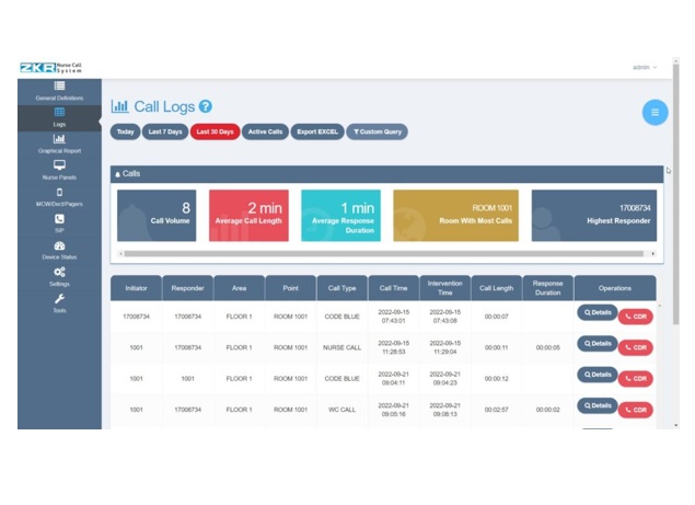 Administrator szpitala może filtrować i przeglądać rejestr połączeń zawierający wszystkie potrzebne dane, takie jak rodzaj połączenia, godzina jego wykonania, odpowiedź pielęgniarki oraz czas, który upłynął od wezwania pielęgniarki do jej pojawienia się. Dzięki systemowi opartemu na technologii RFID oraz kartom z identyfikacją BLE można łatwo sprawdzić, które pielęgniarki odpowiadają na najwięcej wezwań i jak spędzają czas. Wszystkie dane wyświetlają się w postaci łatwych do odczytania graficznych raportów, co pomaga szpitalom w zarządzaniu posiadanymi zasobami.