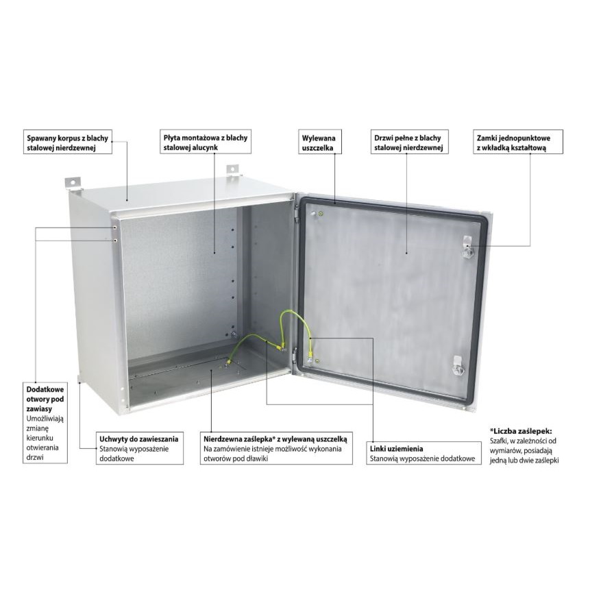 Korpus, drzwi, zaślepka, uchwyty - stal nierdzewna w standardzie 1.4301 wg EN 10088 (AISI 304), możliwy inny gatunek wg indywidualnych uzgodnień